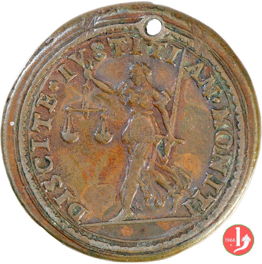 La Giustizia -Mo573 Dritto: _ • PIVS • IIII • PONTIFEX • MAX • AN • IIII entro cerchio perlinato: busto a sx con camauro e mozzetta la figura allegorica della giustizia volta a sinistra regge bilancia e spada | |