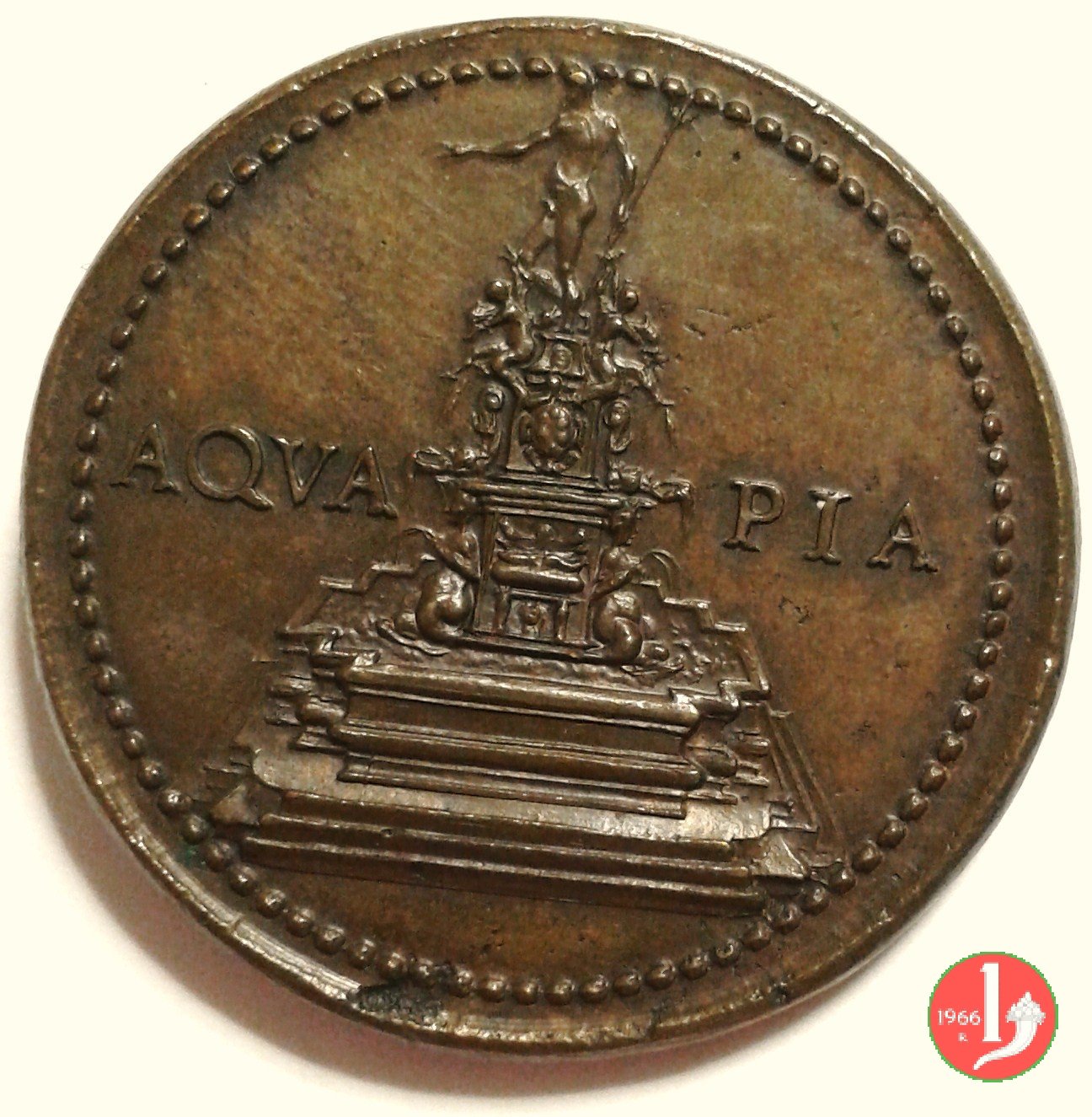 Restauro dell'Acquedotto Pio -Mo544 Dritto: PIVS • QVARTVS • PONTIFEX • MAXIMVS • busto a sx con piviale rappresentazione mitologica della Fonte Ippocrene con Pegaso nel Giadino delle Esperidi | |