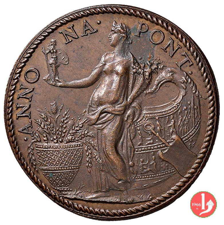 L'annona -Mo810 Dritto: • GREGORIVS • XIII • PONT • MAX • AN • IVBILEI • MDLXXV • busto a sx con triregno e piviale sotto: • LAV • P • l'annona in piedi volta a sx regge cornucopia e statua di Minerva, a destra la poppa di una nave | |