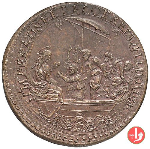 Nuovo Calendario Gregoriano -Mo787 Dritto: GREGORIVS XIII • PONT • OPT • MAXIMVS busto a dx con piviale con la scena del miracolo di Gesú che cammina sulle acque sotto: • L • PARM • testa d'ariete di fronte con collana fogliata in basso demone addormentato | |