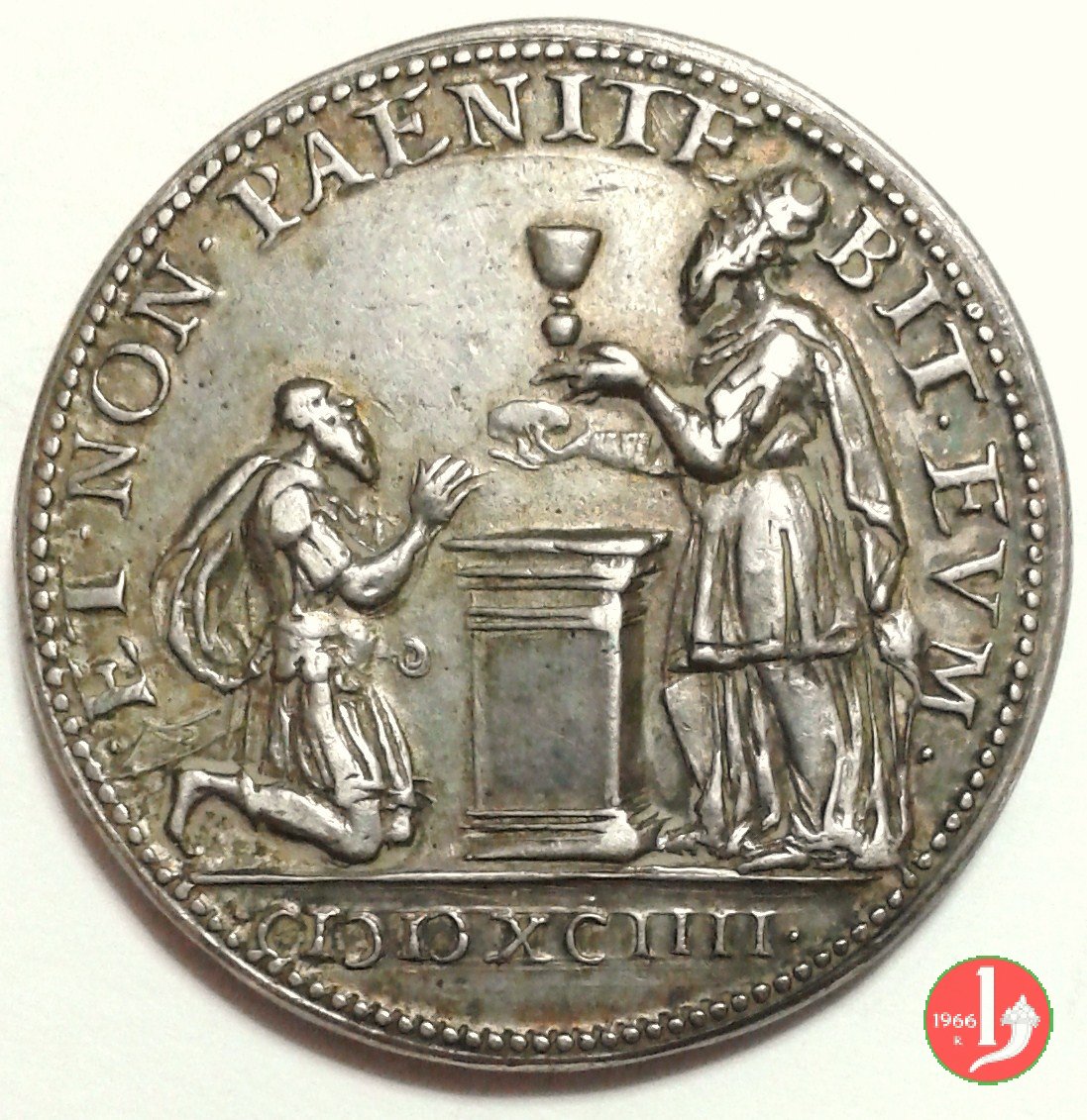 Indizione del Giubileo 1600 Dritto: CLEMENS • VIII • PONT • MAX • AN • III busto a sx con piviale sul taglio spalla: Il Papa a sx, in trono, legge il decreto in esergo: • AN • MDC • | |