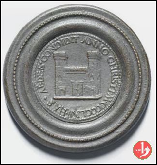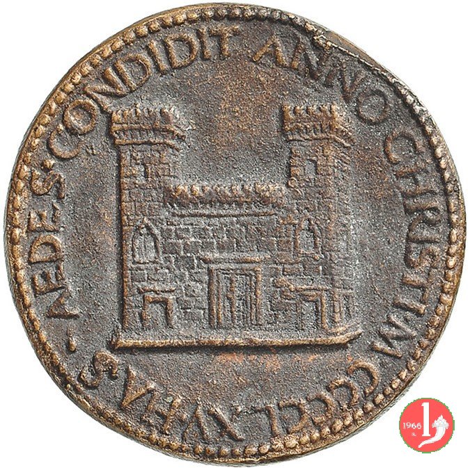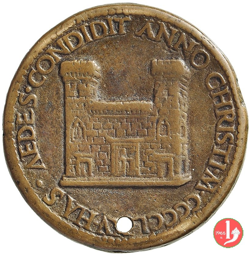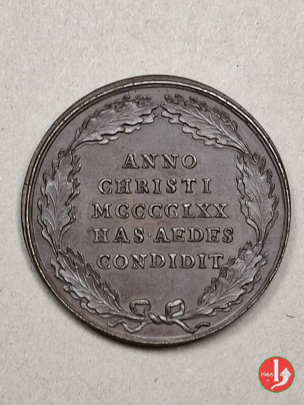 Verso: entro rami d'alloro legati in basso da nastro: ANNO = CHRISTI = MCCCCLXX = HAS HAEDES = CONDIDIT