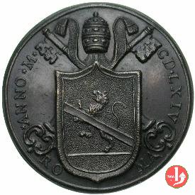 Verso: nel campo: NATVS = VENETIIS = P. NICOLAO BAREO = N. POLIMENA CONDOLMERIA = AB EVGEN • IV • AVVNOVLO • CARDIN • = AS • COLLEG • PONTIF • M • ELECTVS = A • MCCCCLXIV • D • XXXI • AVGVST • = HVMANITATE ET LIBERALITATE = OMNIVM ANIMOS SIBI DEVINXIT = FRIDERICVM III • IMPERAT. = VOTI CAVSSA ROMAM VENIENTEM = SPENDIDISSIME EXCEPIT = PALATIO SVB CAPITOLIVO = EXTRVXIT = A • MCCCLXXI • D • XXV • IVLII = ABTAT. LIV • = OBIIT •