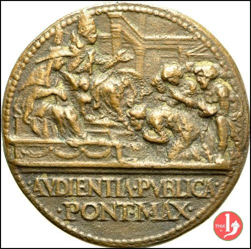 Verso: Il Papa in trono con triregno, volto a dx, dà udienza ad un gruppo di fedeli genuflessi; sullo sfondo loggiato