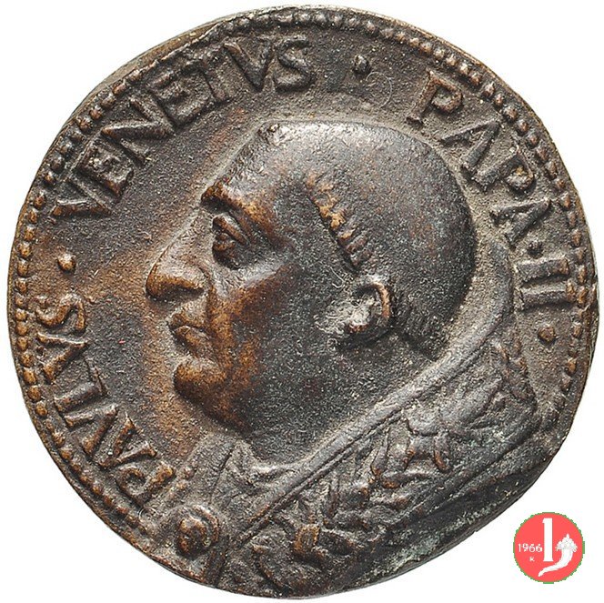 Verso: nel campo: NATVS VENETIIS PATRE NICOL BARBO MAT • POLYXENA CONDOLMERIA AB EVGENIO IV • AVVNCVLO CARDINALIS A SACRO COLLEGIO SVMMVS EPISCOPVS CREATVR AN • MCCCCLXIV XXXI • AVG • VT MAGNIFICENTIAE STVDIOSVS ERAT ITA FRIEDERICVM IMPERATOREM ROMAM VOTI CAVSA VENIENTEM SPLENDIDISSIME EXCEPIT GEORGIVM REG • BOHEM • CENSVRIS BOHEMOS MATTH • VNGAROR • REG • ARMI AFFLIXT IVBILEO ANNOS XXV • DESIGNAVIT RVBRO CARDINALES BIRRETO ORNAVIT MCCCCLXXI • D • XXVI • IVL • APOPLEXIA EXTINCTVS •