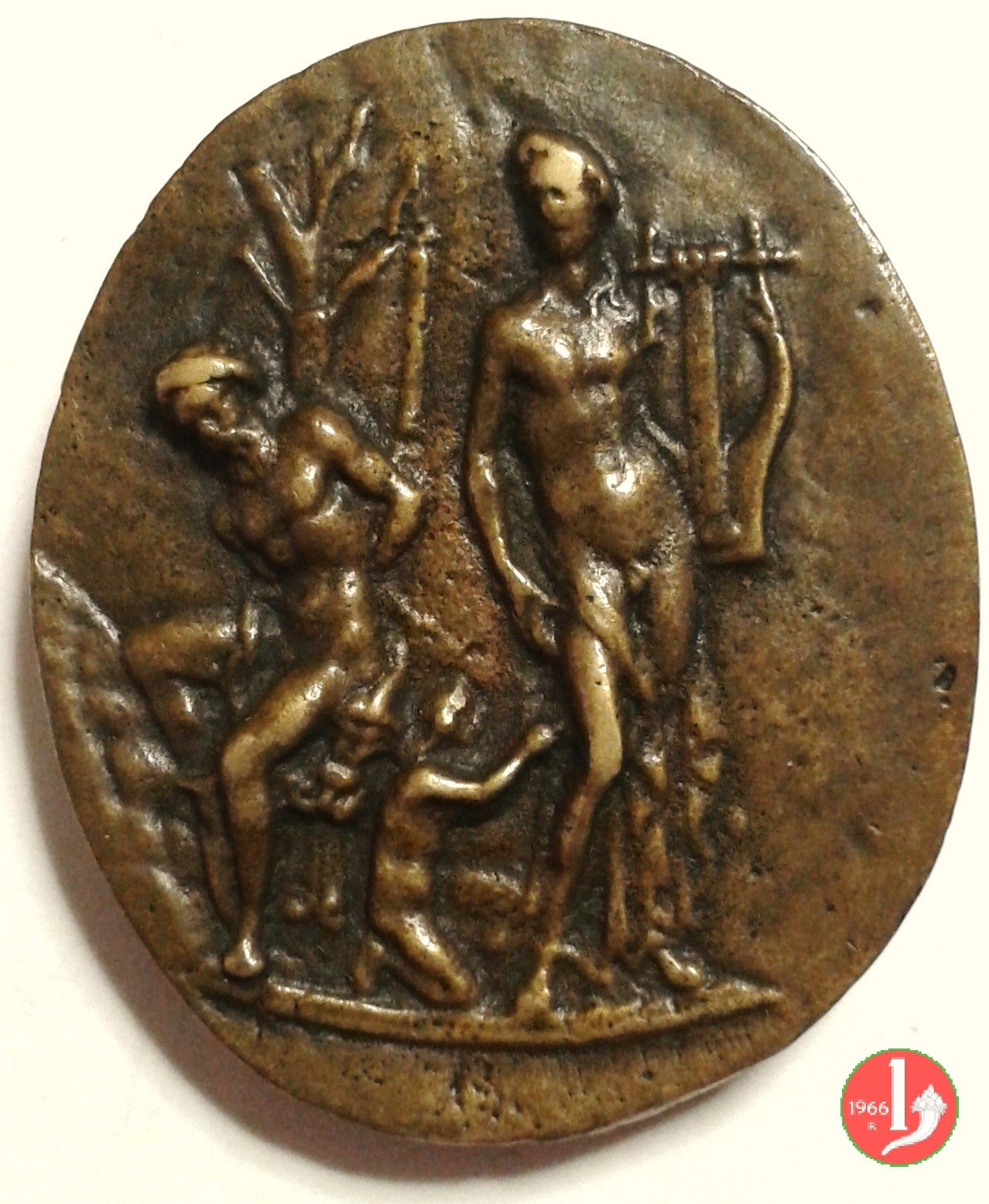 Verso: tra rami di quercia legati da nastro in basso: ANNO = CHRISTI = MCCCCLXX = HAS • AEDES = CONDIT