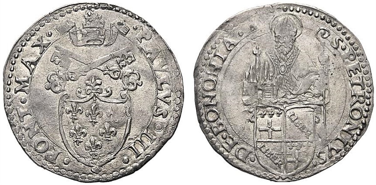 mezzo paolo Dritto: •PAVLVS •III • •PONT •MAX • Stemma semiovale gigliato Verso: •S •PETRONIVS •DE •BONONIA • Busto del Santo sopra armetta di Bologna | |