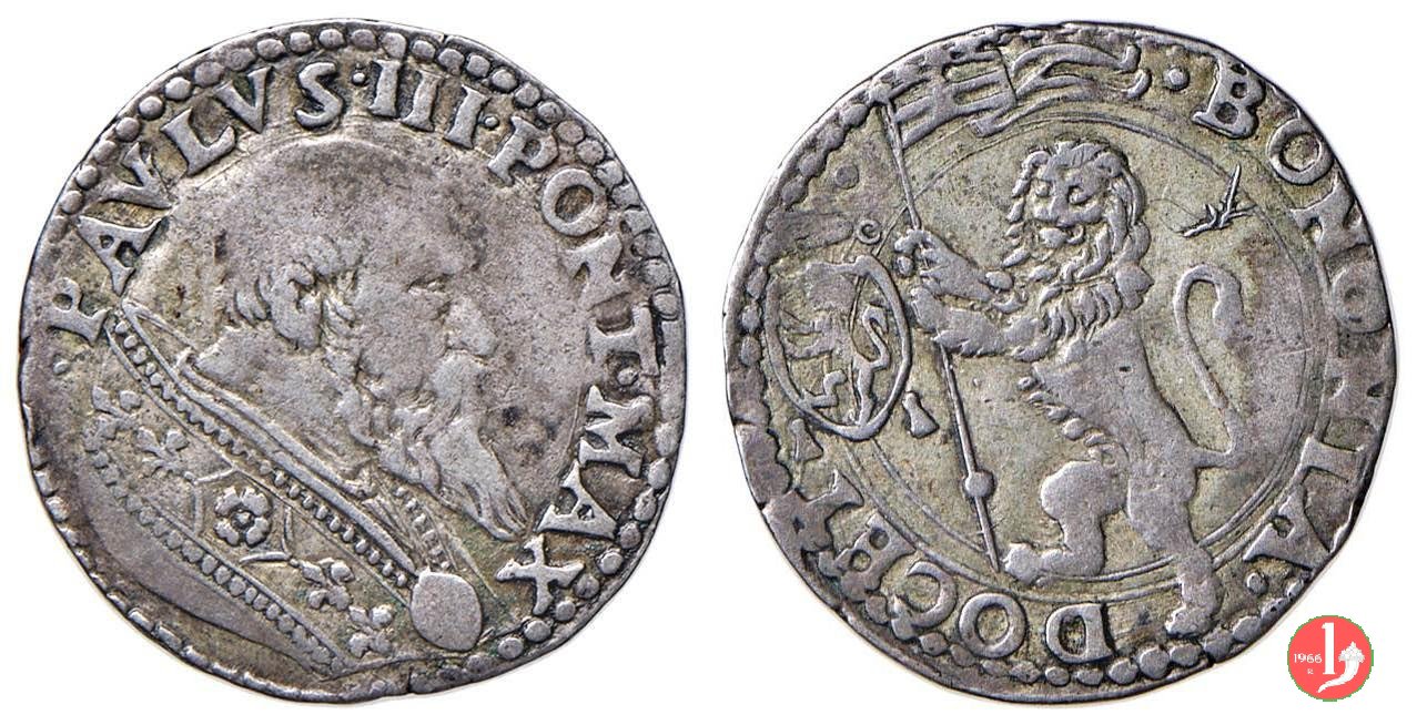 terzo di paolo o grosso Dritto: • PAVLVS • III • • PONT • MAX Stemma di Paolo III con cimasa gigliata, sopra chiavi decussate e tiara Verso: S • P • BONO NIA • DOCET San Petronio in trono con citta' nella mano destra | |