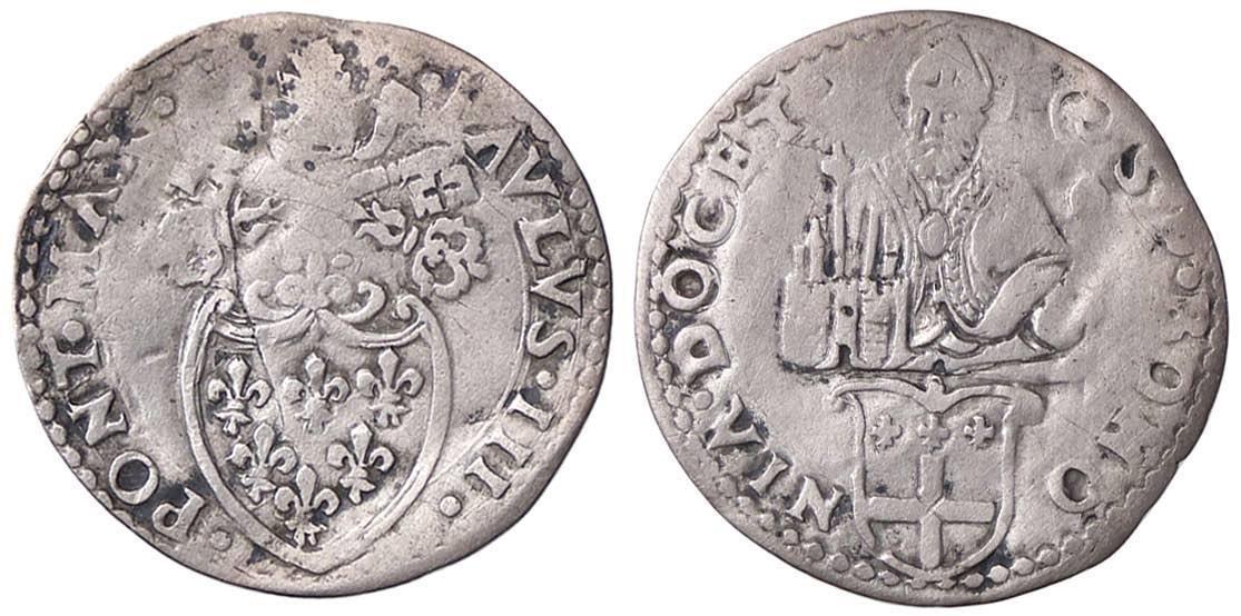 quarto di paolo Dritto: •PAVLVS •III •PONT •MAX • Stemma semiovale, sopra chiavi decussate e tiara Verso: S •P •BONO NIA •DOCET • Busto del Santo sopra armetta | |