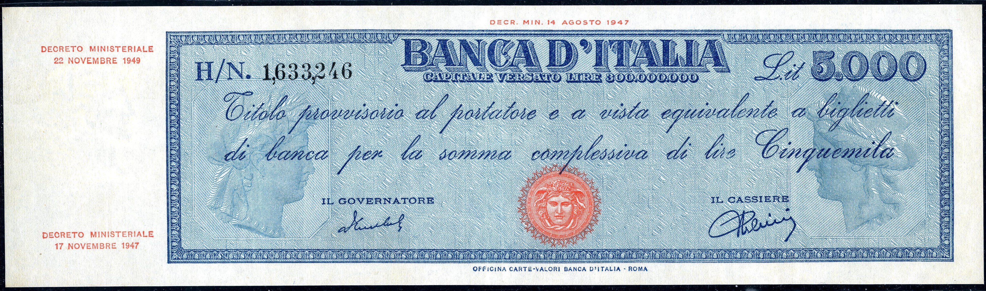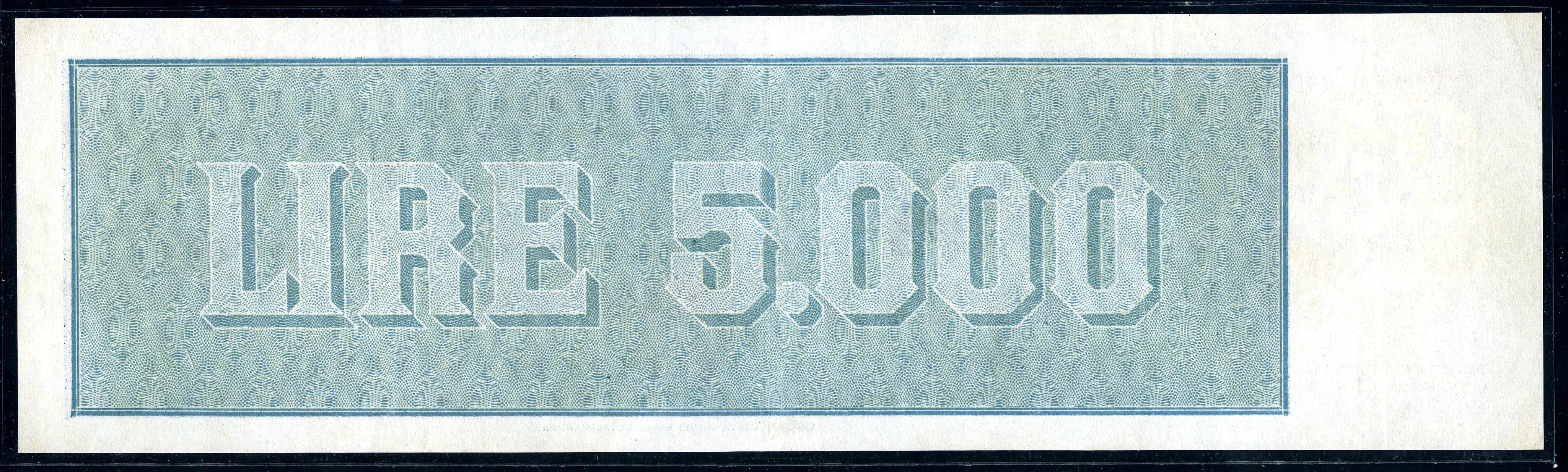 5.000 lire Titolo Provvisorio Dritto: Nei lati due profili di teste affrontate dell'Italia con acconciauture diverse. Verso: Grande scritta "LIRE 5000" | |
