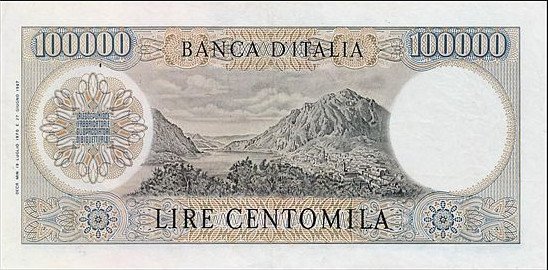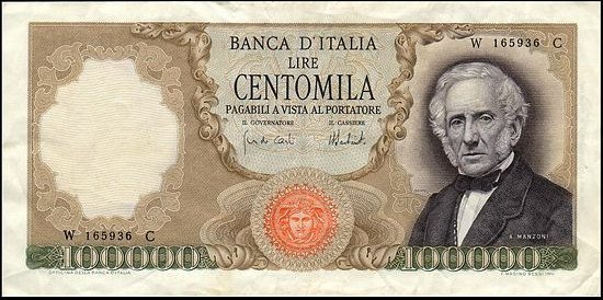 100.000 lire Alessandro Manzoni Dritto: Busto dello scrittore Alessandro Manzoni sul lato destro. Verso: Veduta del lago di Como. | |