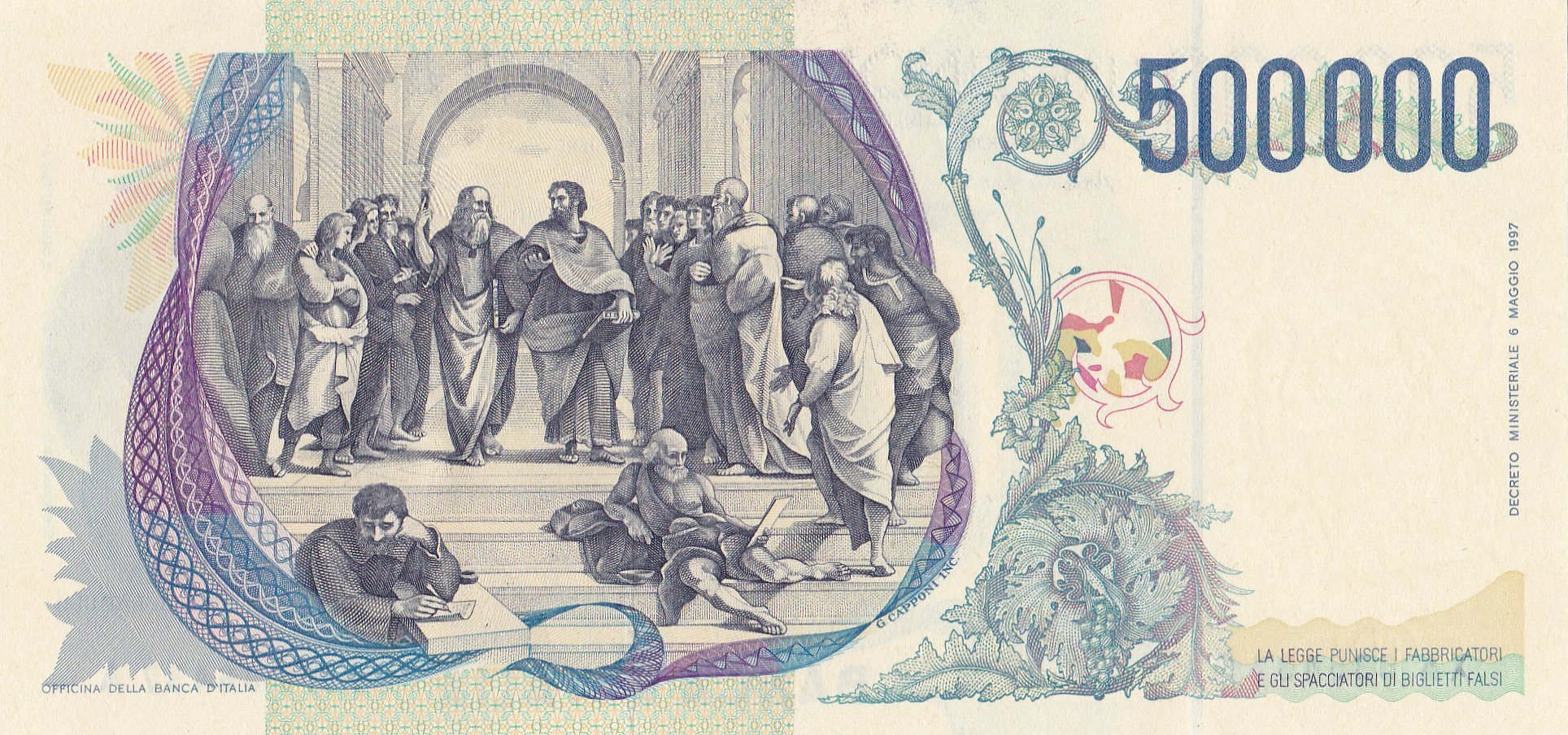 500.000 lire Raffaello Dritto: Effige di Raffaello ispirata all'autoritratto, conservato presso la Galleria degli Uffizi di Firenze. Al centro un particolare dell'affresco "Il trionfo di Galatea" della Villa della Farnesina a Roma. | |