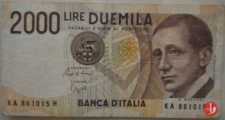 2.000 lire Guglielmo Marconi Dritto: Nella destra ritratto di Guglielmo Marconi. Verso: In alto la nave Elettra; sotto antenne trasmittenti e apparecchio radio. | |