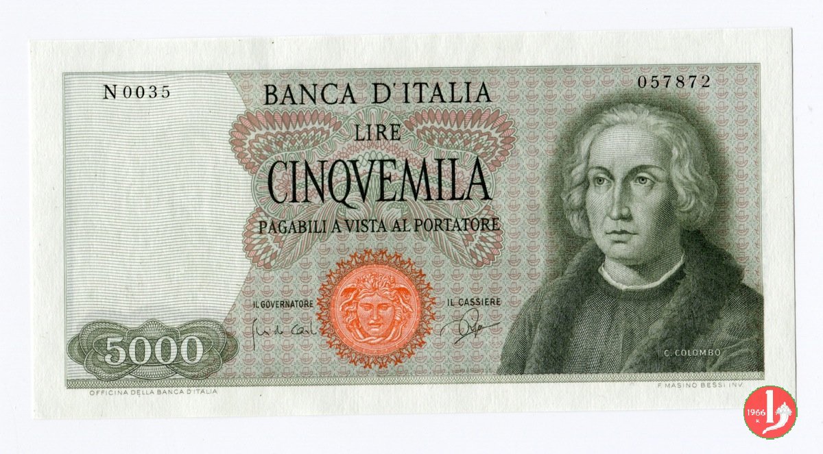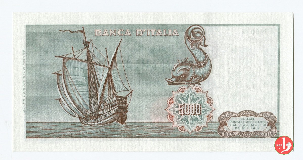 5.000 lire Colombo - Primo tipo Dritto: Nella destra, busto di Cristoforo Colombo. Verso: Nella sinistra, caravella Santa Maria; in alto un delfino. | |