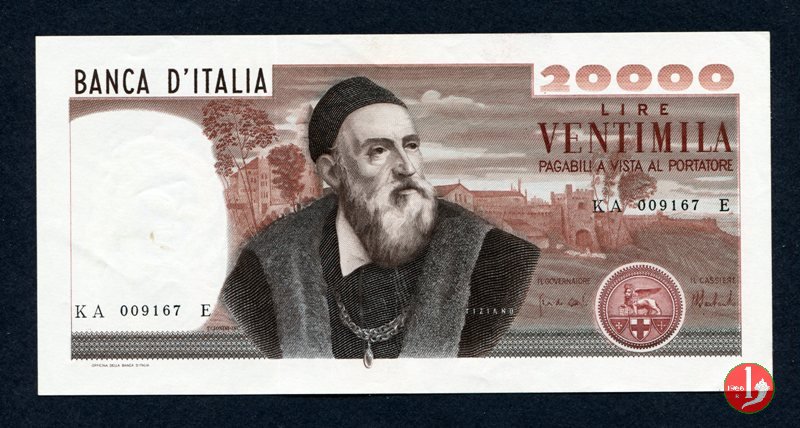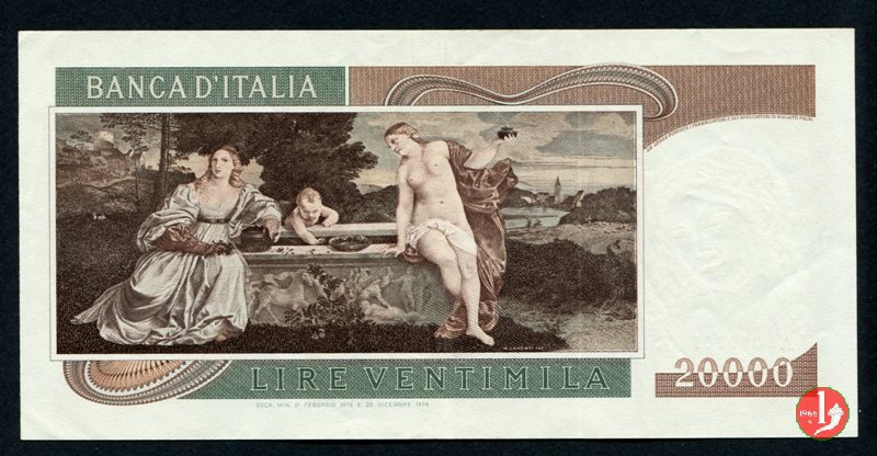 20.000 lire Tiziano Dritto: Busto di Tiziano Vecellio, ispirato all'autoritratto conservato presso la Galleria degli Uffizi di Firenze. Alle spalle un paesaggio dipinto da Tiziano in uno degli affreschi della Scuola del Santo ("Miracolo del piede risanato"), nella basilica di S. Antonio a Padova. Verso: Riproduzione del dipinto "Amor Sacro e Amor Profano" del Tiziano, conservato nella Galleria Borghese in Roma. | |
