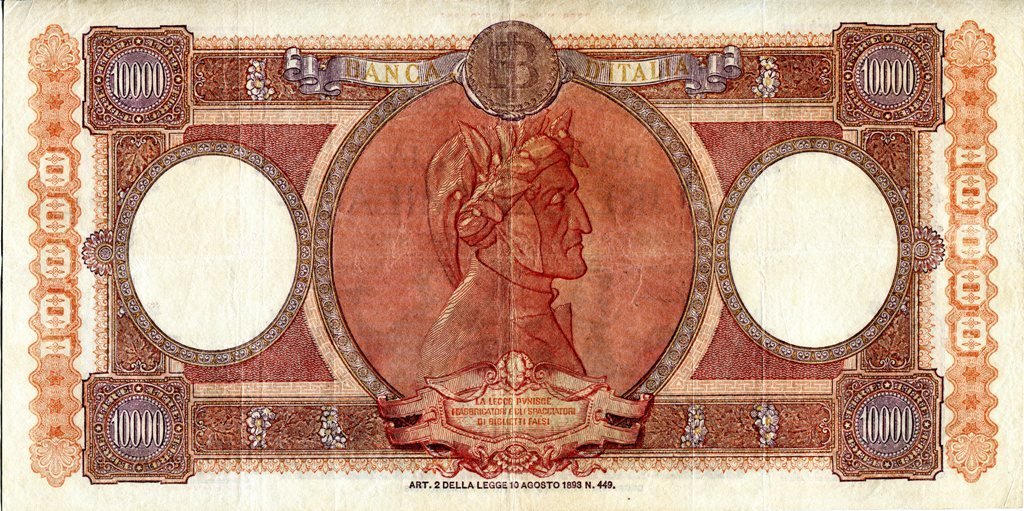 10.000 lire Repubbliche Marinare Dritto: Nel centro due maestose figure femminili sedute, impugnanti il bastone del comando e poggianti sugli stemmi delle città marinare che rappresentano: Venezia e Genova; nei contorni motivi floreali. Verso: Nel medaglione centrale, profilo idealizzato di Dante Alighieri con il capo cinto di foglie d'alloro. | |
