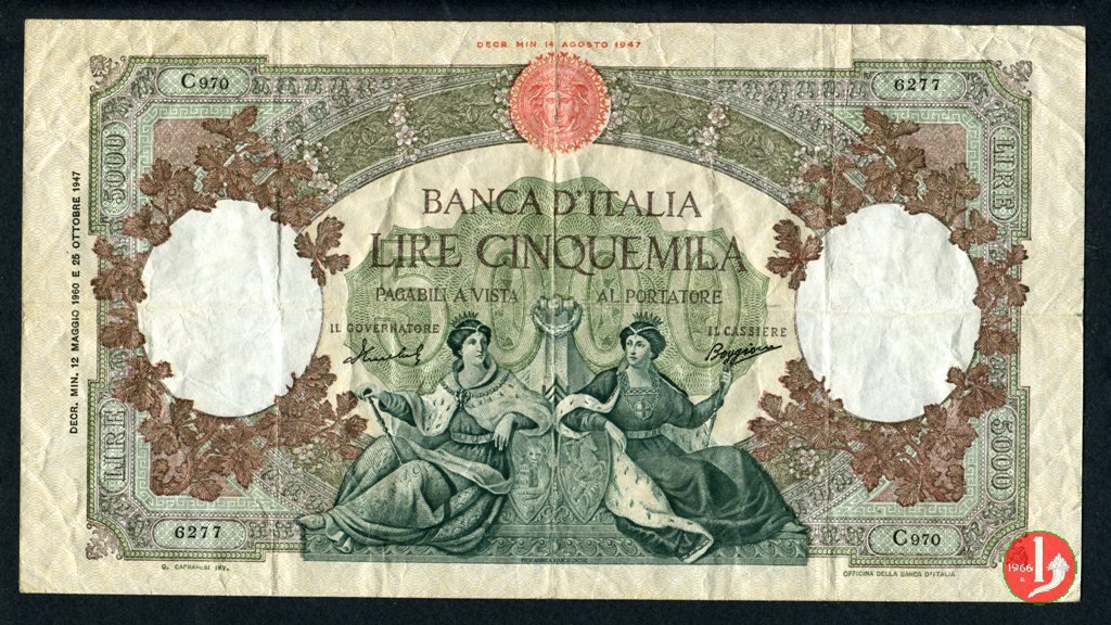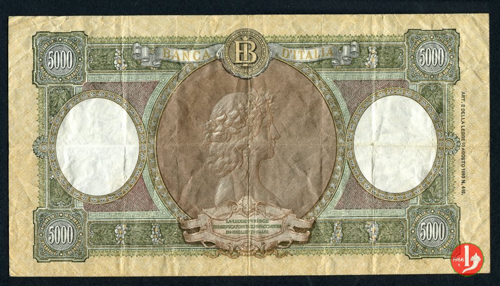 5.000 lire Repubbliche Marinare Dritto: Ovale formato da un festone floreale che si collega nelle estremità a due ovali contenenti le filigrane, circondati da una ornamentazione libera in foglie di quercia, in giallo oro vecchio. Nella parte inferiore due maestose figure femminili sedute, impugnanti il bastone del comando e poggianti sugli stemmi delle città marinare di Venezia e Genova. Verso: Entro il medaglione centrale compare una testa di Folora. | |
