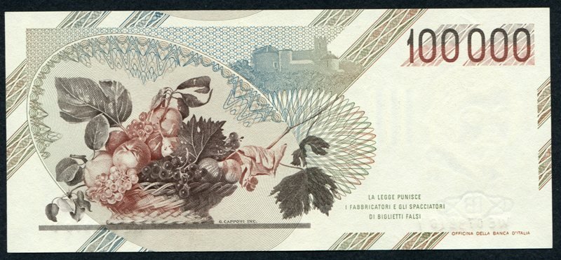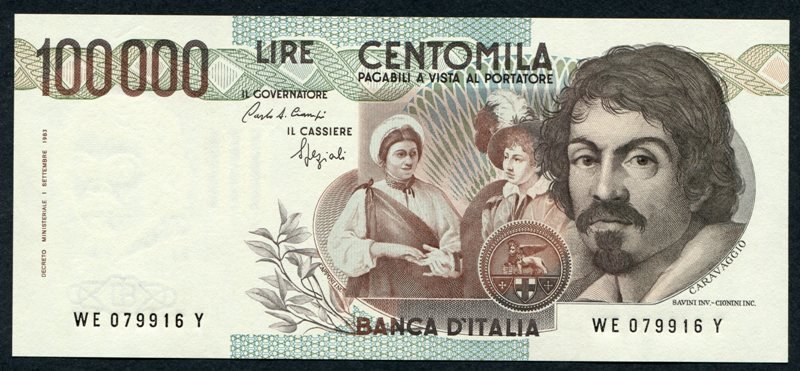 100.000 lire Caravaggio Dritto: Sulla destra, testa di Michelangelo Merisi da Caravaggio. Sullo sfondo, al centro, rappresentazione di un particolare del dipinto "Buona Ventura". Dipinto custodito al Louvre di Parigi. Dipinto custodito nella Pinacoteca Ambrosiana di Milano. | |