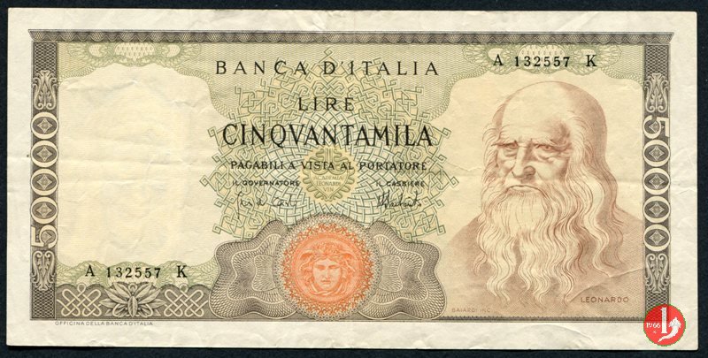 50.000 lire Leonardo da Vinci Dritto: A destra, busto di Leonardo, ispirato ad un autoritratto realizzato a sanguigna. Verso: Al centro, veduta del paese di Vinci, città natale di Leonardo. | |