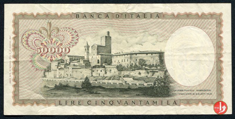 50.000 lire Volto di donna Dritto: A sinistra busto di giovanne Donna. Verso: Cappella, colonnato e motivi architettonici. | |