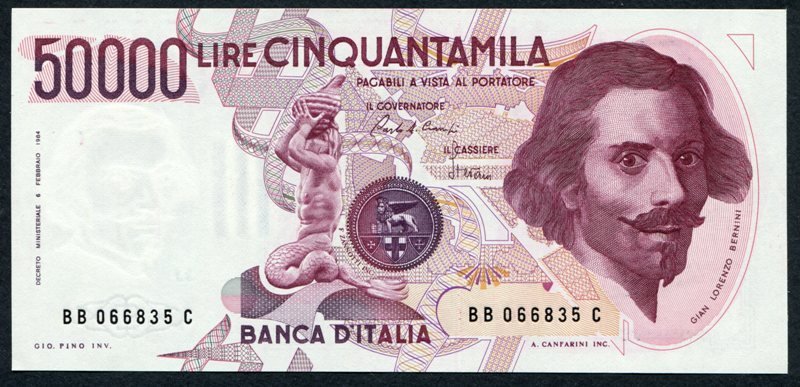 50.000 lire Bernini Dritto: Sulla destra testa di Gian Lorenzo Bernini. Sullo sfondo, al centro, particolare della Fontana del Tritone. Autoritratto custodito Galleria Borghese in Roma. | |
