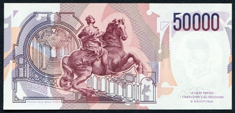 50.000 lire Volto di donna Dritto: A sinistra busto di giovanne Donna. Verso: Cappella, colonnato e motivi architettonici. | |