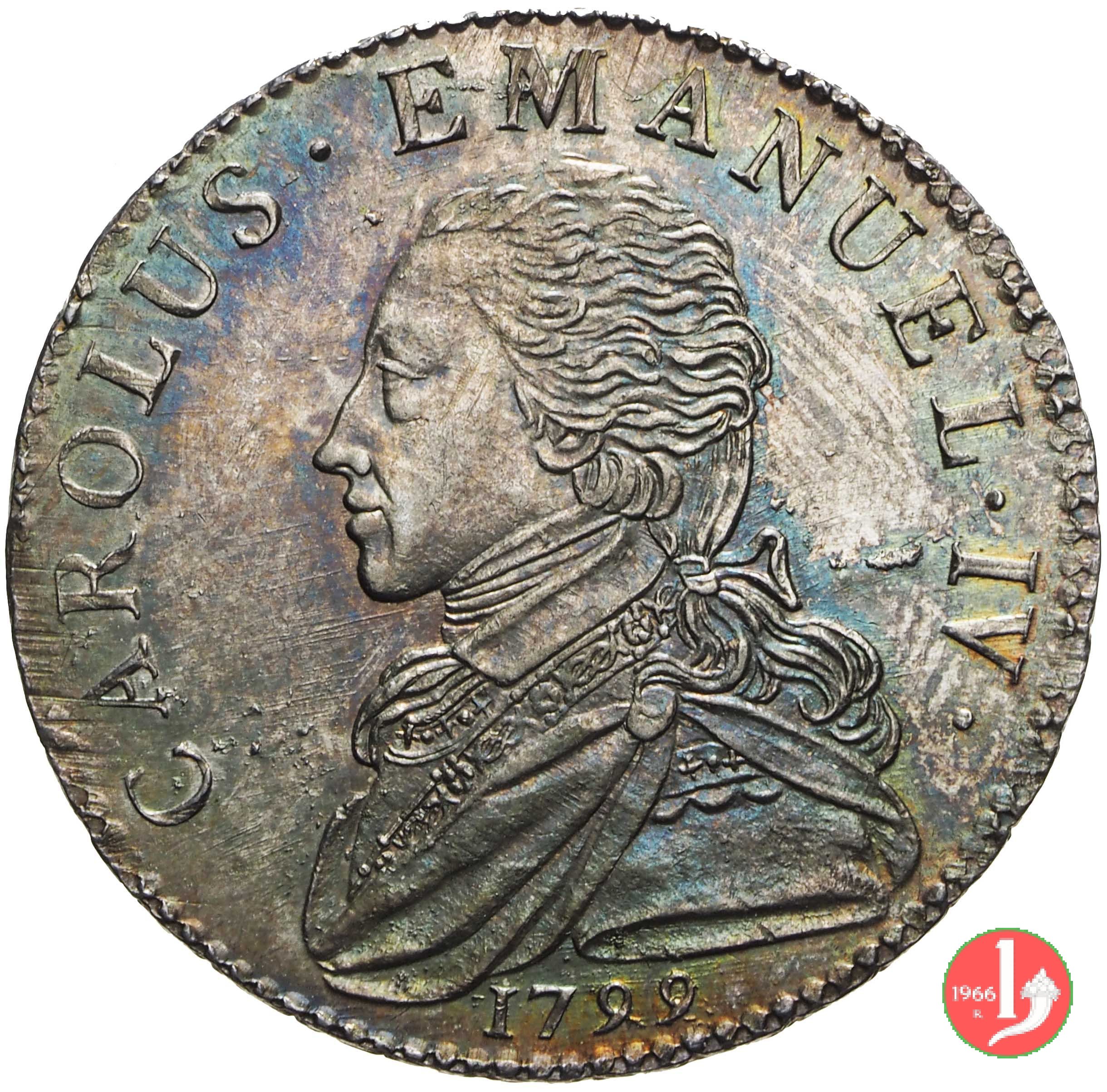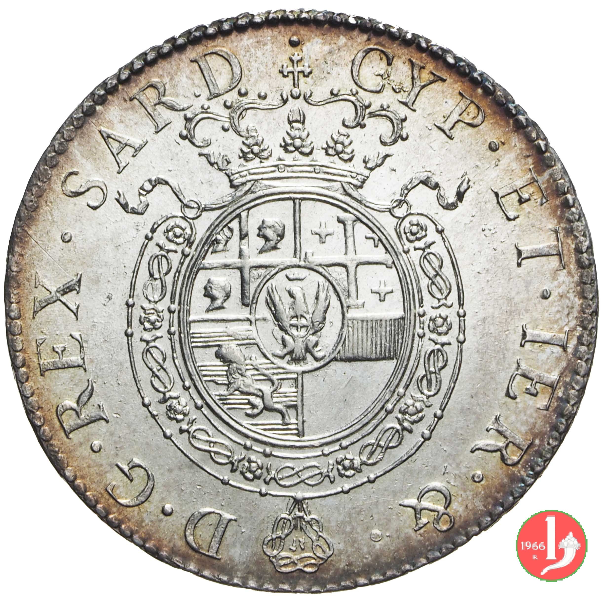 1/2 scudo Dritto: Busto del Re volto a sinistra. Intorno CAROLUS • EMANUEL • IV •, sotto il millesimo. Verso: Stemma sabaudo ovale ornato dal collare dell'Annunziata. Intorno D • G • REX • SARD • CYP • ET • IER • & •. |