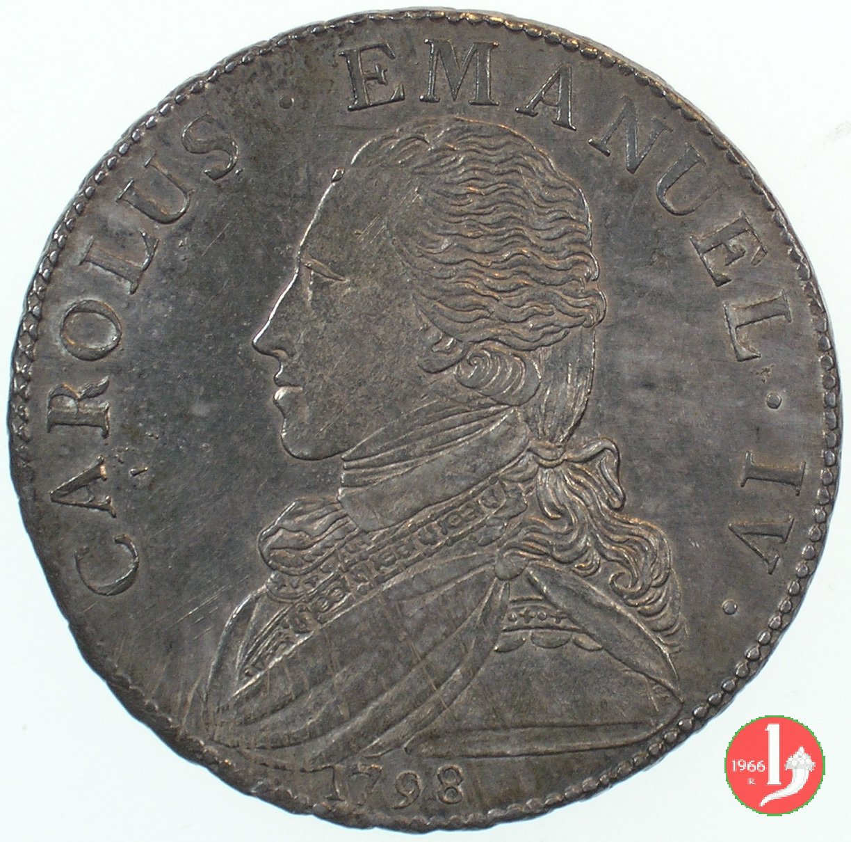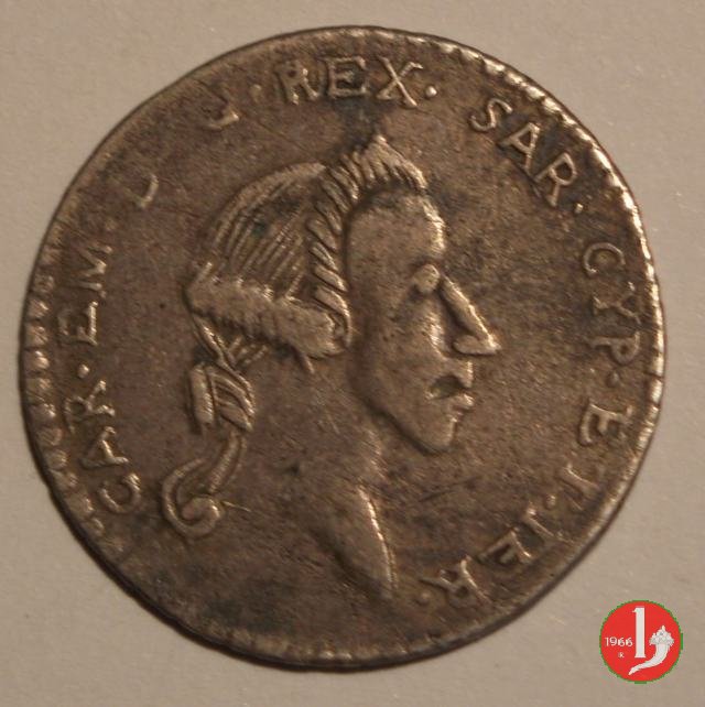 1/4 di scudo Dritto: Busto del Re volto a sinistra. Intorno CAROLUS • EMANUEL • IV •, sotto il millesimo. Verso: Stemma sabaudo ovale ornato dal collare dell'Annunziata. Intorno D • G • REX • SARD • CYP • ET • IER • & •. |