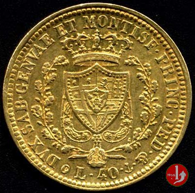 Marengo Dritto: Testa del Re a sinistra, al di sotto della quale si trova il millesimo. Lungo il bordo, CAR • FELIX D • G • REX SAR • CYP • ET HIER •. Sul taglio del collo indicazione dell'autore (A • L • per Amedeo Lavy). Verso: Stemma di casa Savoia a cuore sovrastato da Corona Reale e fregiato dal collare dell'Annunziata tra rami di quercia. Lungo il bordo: DVX SAB • GENVAE ET MONTISF • PRINC • PED • & •. In basso, attorniato dal segno di zecca, indicazione del valore (L • 20 •). | |