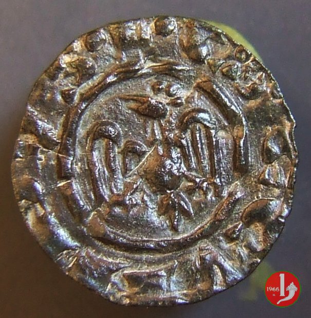Denaro (aquila testa a s.) Dritto: Aquila coronata di fronte con le ali aperte e testa volta a sinistra.
