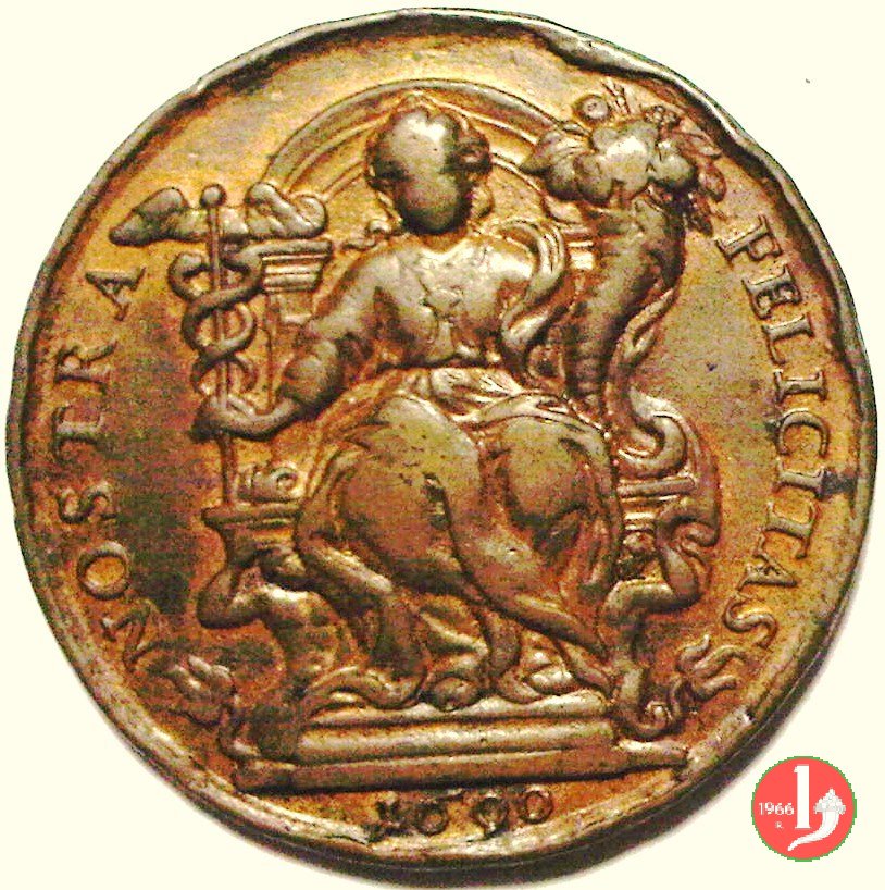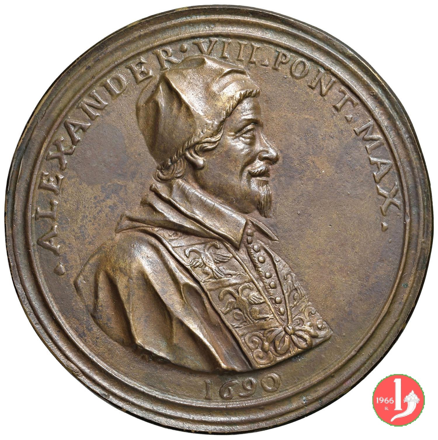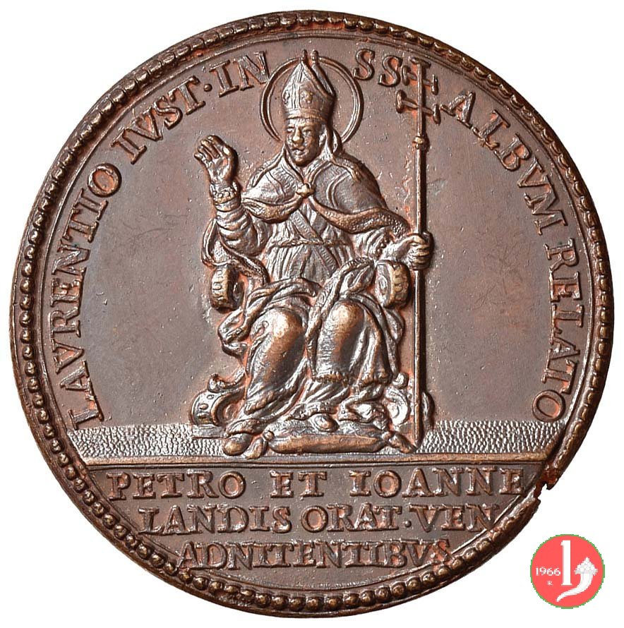 Canonizzazione di Lorenzo Giustinian -M272 Dritto: ALEXAN _ VIII • PONT • MAX (punti celtici) busto con triregno e piviale a dx sotto: HAMERANVS • F • San Lorenzo Giustinian, nimbato, seduto di fronte con mitra e triplice Croce benedicente in esergo: PETRO ET IOANNE = LANDIS ORAT • VEN = ADNITENTIBVS |