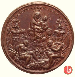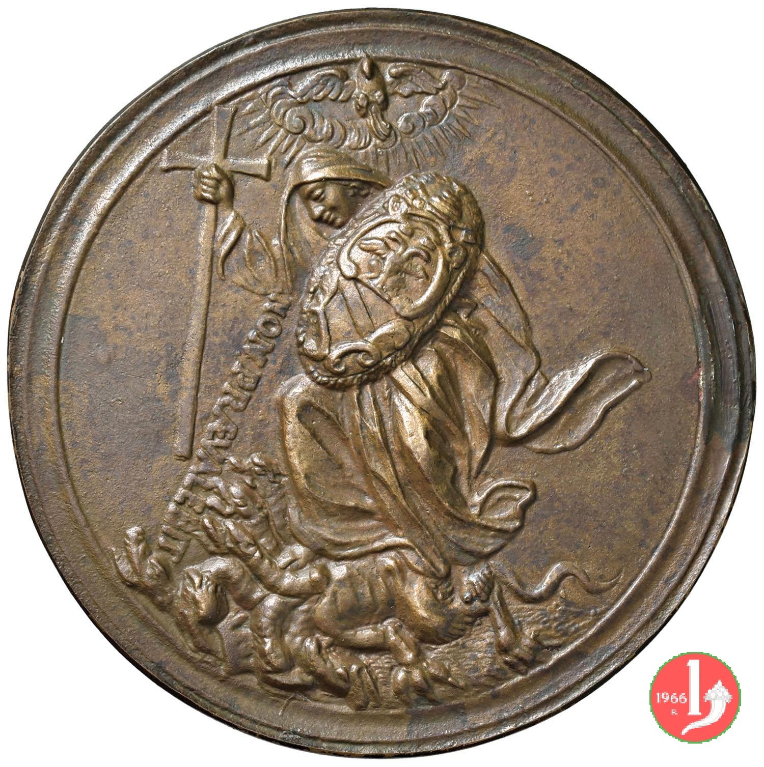 Vittoria di Venezia sui Turchi -M269 Dritto: ALEXAN • VIII • PONT • MAX • AN • I busto a dx con camauro, mozzetta e stola sotto: GJOS • ORTOLANJ VTS F. La B. V. nimbata col Bambino raggiante di fronte su nubi, ai lati trofei militari e in primo piano ai lati due Turchi prigionieri legati | |