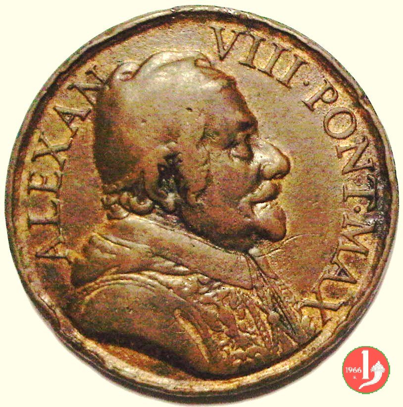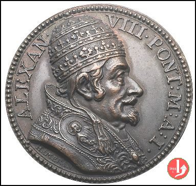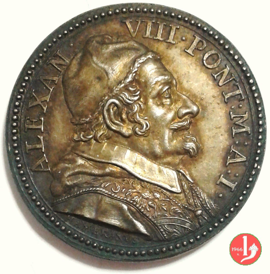 Possesso del Laterano -M260 Dritto: ALEXAN • VIII • PONT busto a dx con triregno e piviale sotto: HAMERAN La colomba dello Spirito Santo raggiante ad ali spiegate sopra la linea dell'esergo: ROMAE | |