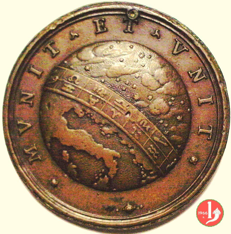 Elezione al pontificato -Mvnit et vnit -M278 Dritto: ALEXAN _ VIII • PONT • MAX busto a dx con triregno e piviale sotto: HAMERANVS • F Il Globo terrestre diviso diagonalmente dalla fascia zodiacale, sopra il cieli e le stelle, sotto l'Italia | |