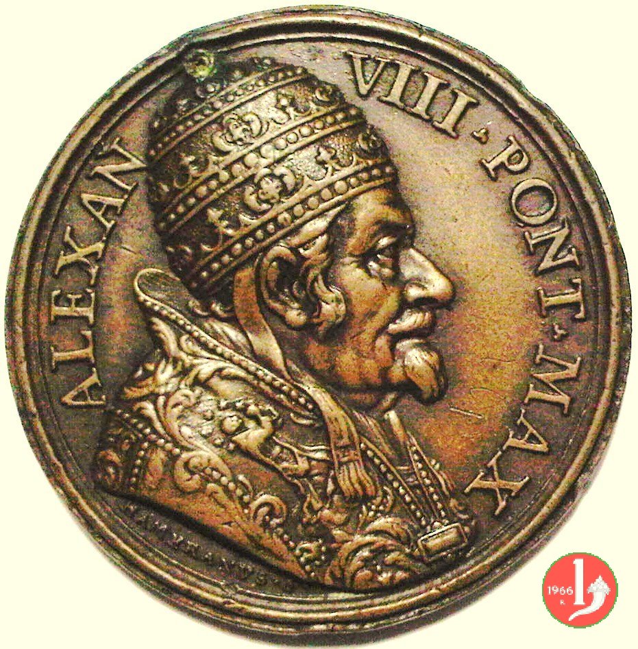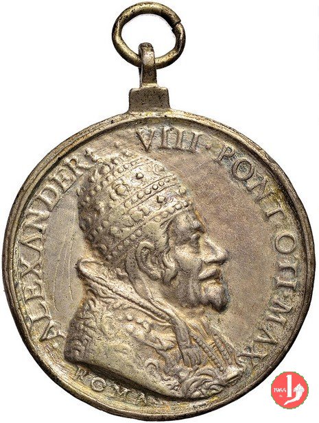 Cristo guarisce il lebbroso -M285 Dritto: • ALEXAN _ DER • VIII • PO • M • busto a dx con triregno e piviale sotto: fregio Cristo raggiante verso sx guarisce lebbroso |