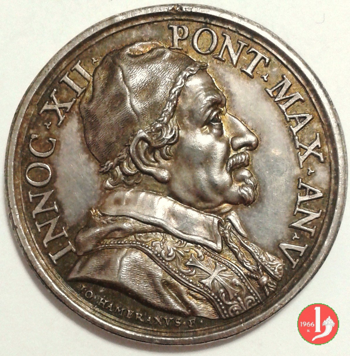Concistoro 1695 -M318 Dritto: INNOC • XII _ • PONT • MAX • busto a dx con camauro, mozzetta e stola sotto: S _ • URBAIN • Figura allegorica della Virtú di fronte ragge asta e corona di alloro ai lati dei piedi: AN • _ V • in esergo: FERDINAND • DE • = S • URBAIN • | |