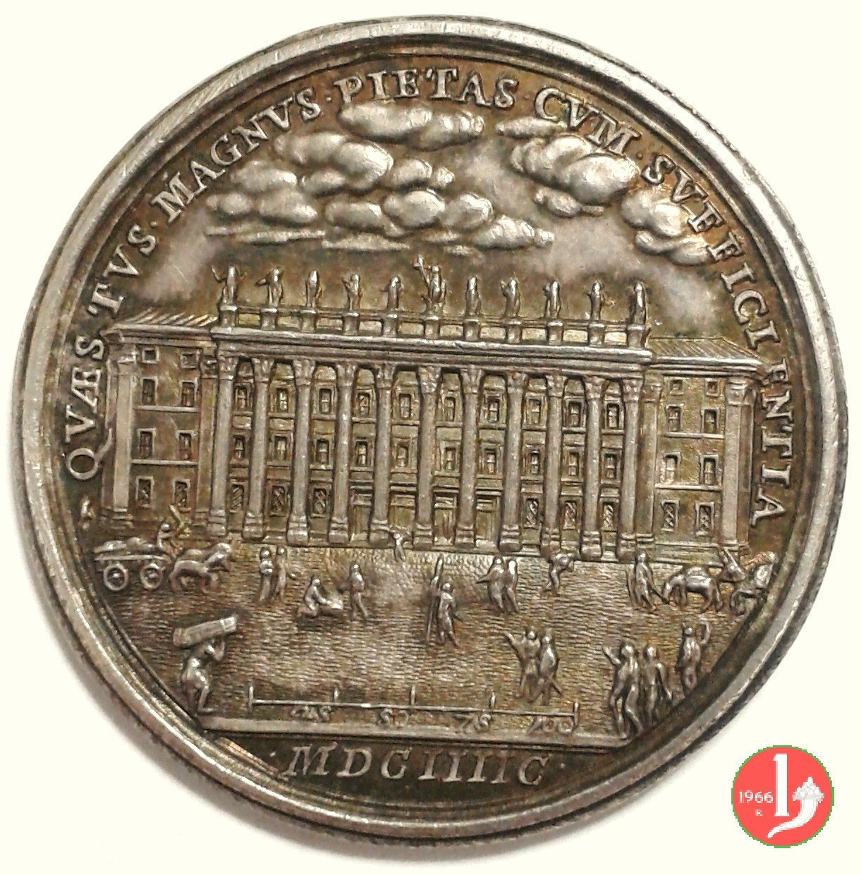 A. V -Dogana di Terra in P.za di Pietra -M320 Dritto: INNOC • XII • _ PONT • MAX • AN • V busto a dx con camauro, mozzetta e stola sotto: IO • HAMERANVS • F • Prospetto anteriore del nuovo edificio in esergo: • MDCIIIIC • |