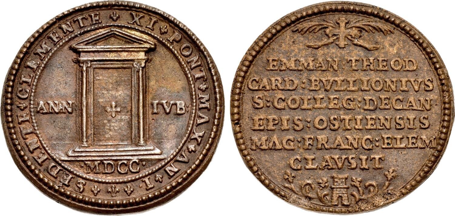 Chiusura della Porta Santa -M15 Dritto: CLEM • XI • P • M • _ CREA • XXIII • NOV • MDCC • busto con triregno e piviale a dx sotto: HAMERANVS • F. Il Papa assistito dalla corte chiude la Porta Santa in esergo incuso: • 1700 • | |