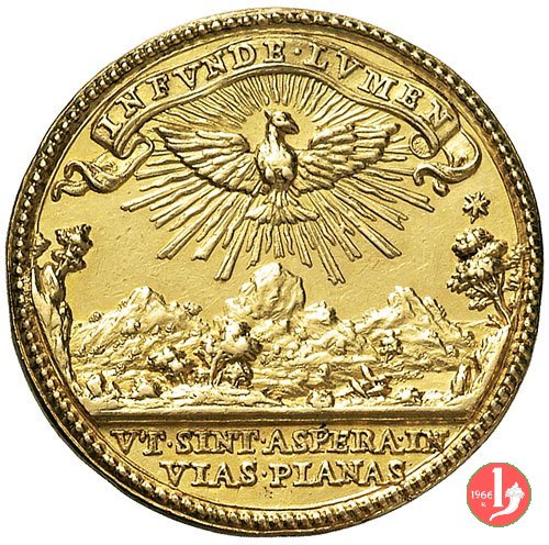 Elezione al pontificato -Sole -M12 Dritto: CLEMENS < XI < _ PONT < OPT < MAX < A < I < busto a dx con camauro, mozzetta e stola sotto: HERMENEGILDVS HAMERANVS Il sole raggiante illumina paesaggio | |
