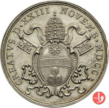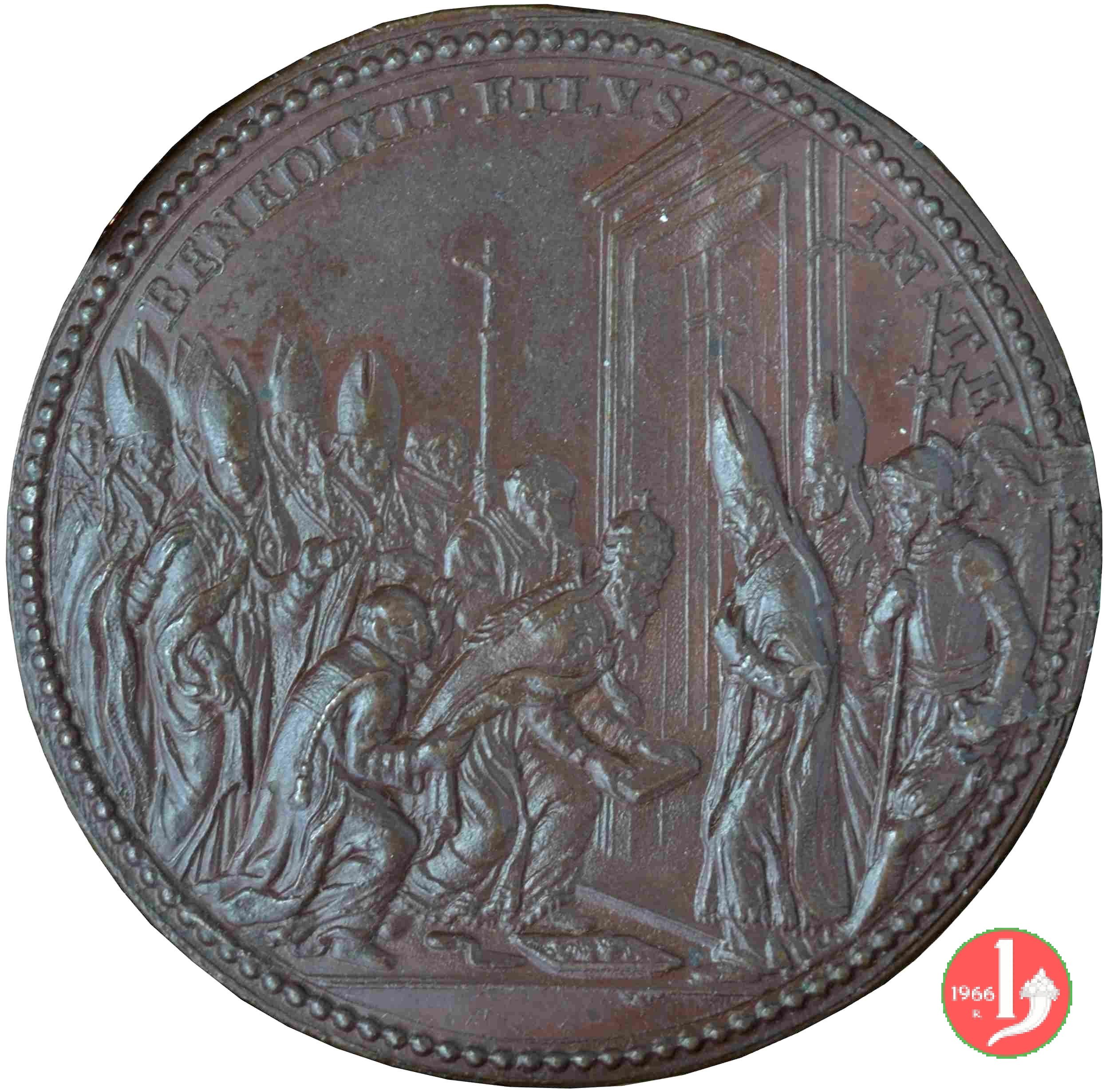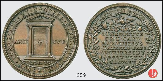 Porta Santa Basilica Lateranense -M17 Dritto: SVB + INNOC + XII + ET + SVCCESS + CLEM + XI + PP + M + <> + in corona perlinata: la Porta Santa chiusa, al centro croce gigliata raggiante, ai lati: ANN _ IVB in esergo: MDCC • entro corona di alloro sormontata da colomba della pace: BENEDICTVS = S.R.E. CARD = PAMPHILIVS = SS • LATERAN • BASIL = ARCHIPRESBY = APERVIT • ET = CLAVSIT | |