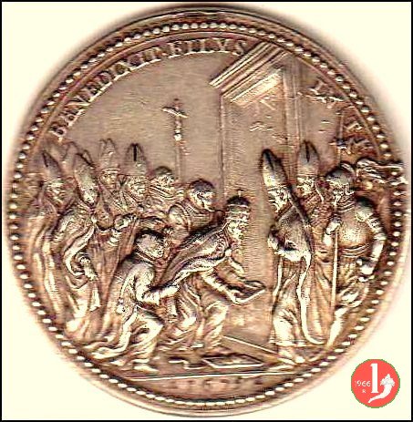 Chiusura della Porta Santa -M15a Dritto: CLEM • XI • P • M • _ CREA • XXIII • NOV • MDCC • busto con triregno e piviale a dx sotto: HAMERANVS • F. Il Papa assistito dalla corte chiude la Porta Santa in esergo incuso: 1675 | |