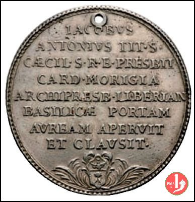 Porta Santa Basilica Liberiana -M18 Dritto: INNOCENT • XII • A • IX (padiglione su chiavi decussate) CLEMENT • XI • SED • A • I entro cerchio a festone: la Porta Santa chiusa con colomba raggiante sul frontone e QVA PERVIA CREA sulla trabeazione, contenente, tra colonne corinzie, l'Immagine della B.V. Maria col Bambino su nube e Croce greca gigliata e raggiante; ai lati: ANN _ IVB in esergo: • MDCC • sotto, tra rami di palma: l'arma del Cardinale Giacomo Antonio Morigia | |