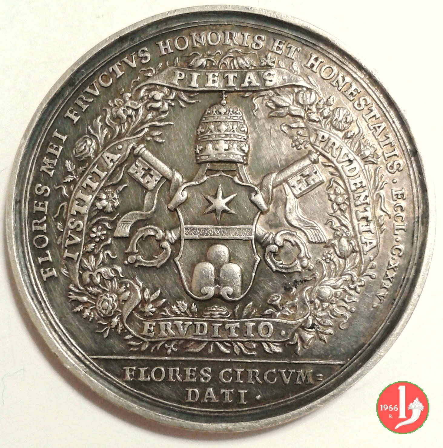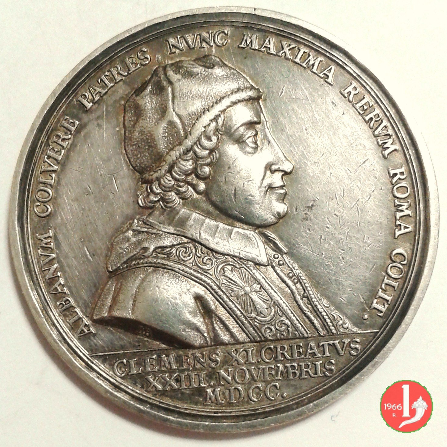 Elezione al pontificato -M6 Dritto: ALBANVM COLVERE PATRES NVNC MAXIMA RERVM ROMA COLIT. busto a dx con camauro, mozzetta e stola sotto monogramma: MB in esergo: CLEMENS XI. CREATVS = XXIII.NOVEMBRIS = MDCC. Stemma Papale coronato da triregno e chiavi decussate in corona d'alloro legata da nastro iscritto: IVSTITIA • _ PIETAS • _ PRVDENTIA • _ ERVDITIO • in esergo: FLORES CIRCVM • = DATI • | |