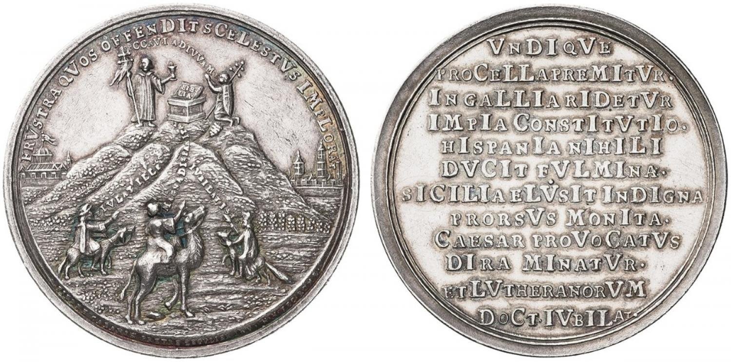 Verso: nel campo: VNDIQVE = PROCELLA PREMITVR = IN GALLIA RIDETVR = IMPIA = CONSTITVTIO. = HISPANIA NIHILI = DVCIT FVLMINA. = SICILIA ELVSIT INDIGNA = PRORSVS MONITA. = CAESAR PROVOCATVS = DIRA MINATVR. = ET LVTHERANORVM = DOCT • IVBILAT.