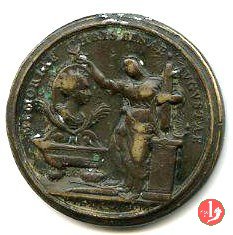 Premio Accademia di S. Luca -M50 Dritto: nella corona esterna: ACADEMIA * PICTOR * SCVLPTOR * ET * ARCHITECT * VRBIS * * 1705 * nel cerchio interno: CLEM • XI • _ • PONT • OPT • M • busto benedicente con triregno e piviale a dx sul taglio spalla: OPVS • sotto: HAMERANI San Luca nimbato verso dx in atto di dipingere, al cavalletto, l'immagine della Madonna con bambino che gli appare in ato raggiante tra nubi, a dx il toro assiso | |