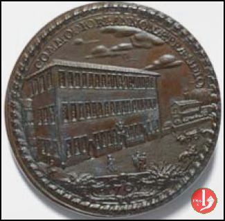 A. V -Nuovo Edificio dell'Annona -M47 Dritto: CLEMENS * _ * XI * P * M * AN * V * busto a dx con triregno e piviale sul taglio spalla: • E • H • Il nuovo edificio dell'annona presso la chiesa di S. Bernardo (a dx) in esergo: • 1705 • | |