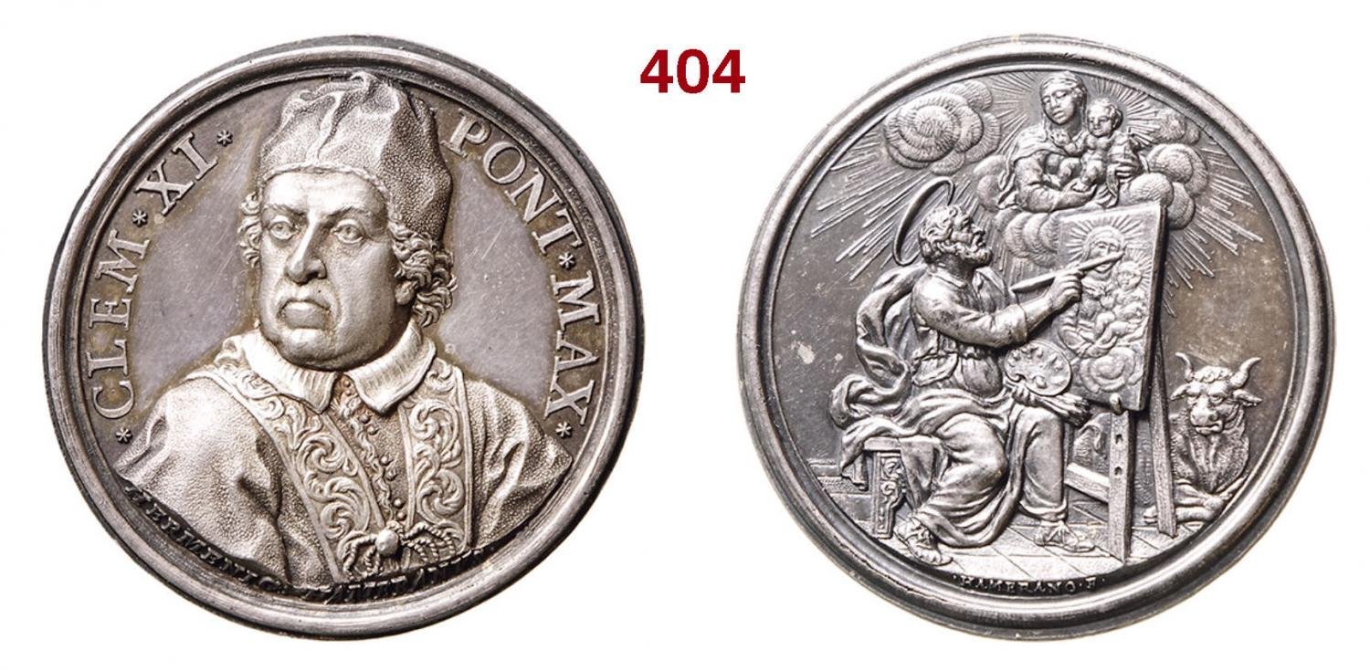 Premio Accademia di S. Luca -M51 Dritto: * SVBLATIS * PRAEMYS * VIRTVTES * INTEREVNT * C • TAC • * nel cerchio interno: CLEMENS * XI * _ * PONT * MAX busto a sx con camauro, mozzetta e stola sotto: HERMEN San Luca nimbato verso dx in atto di dipingere, al cavalletto, l'immagine della Madonna con bambino che gli appare in ato raggiante tra nubi, a dx il toro assiso | |