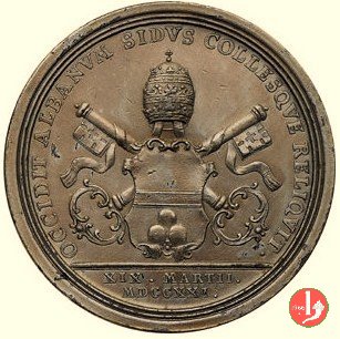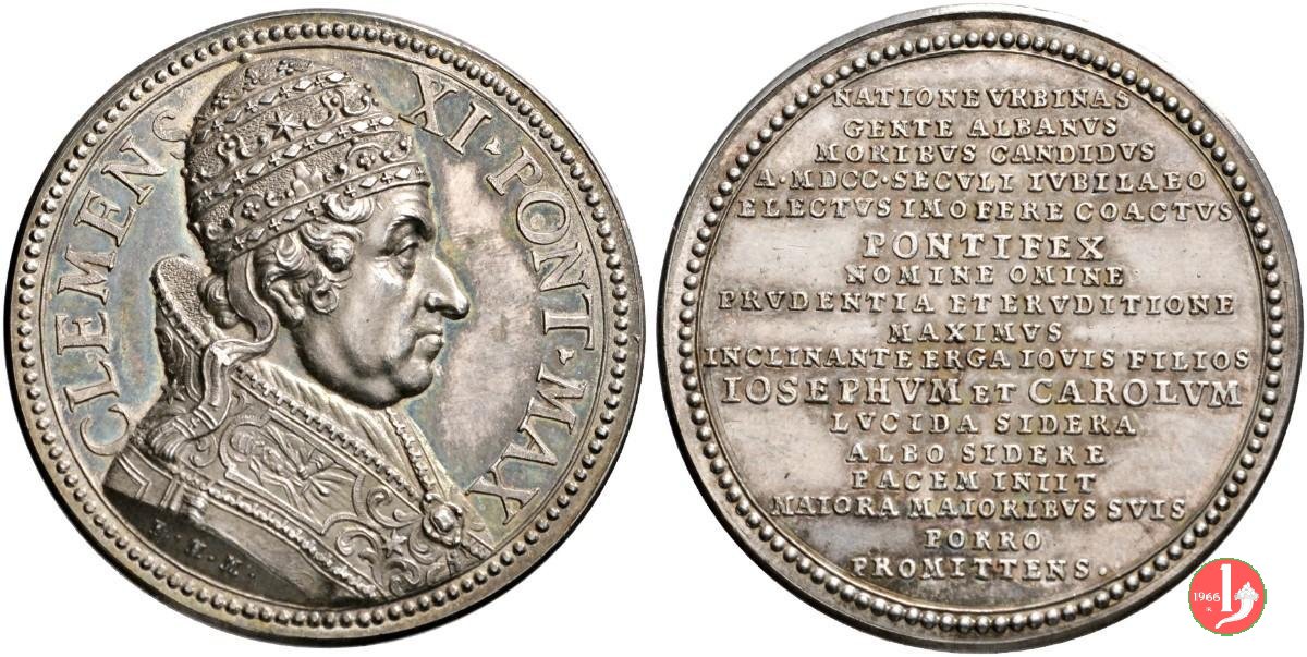 Verso: NATIONE VRBINAS = GENTE ALBANVS = MORIBVS CANDIDVS = A • MDCC • SECVLI IVBILAEO = ELECTVS IMO FERE COACTVS = PONTIFEX = NOMINE OMINE = PRVDENTIA ET ERVDITIONE = MAXIMVS = INCLINATE ERGA IOVIS FILIOS = IOSEPHVM ET CAROLVM = LVCIDA SIDERA = ALBO SIDERE = PACEM INIIT = MAIORA MAIORIBVS SVIS = PORRO = PROMITTENS •