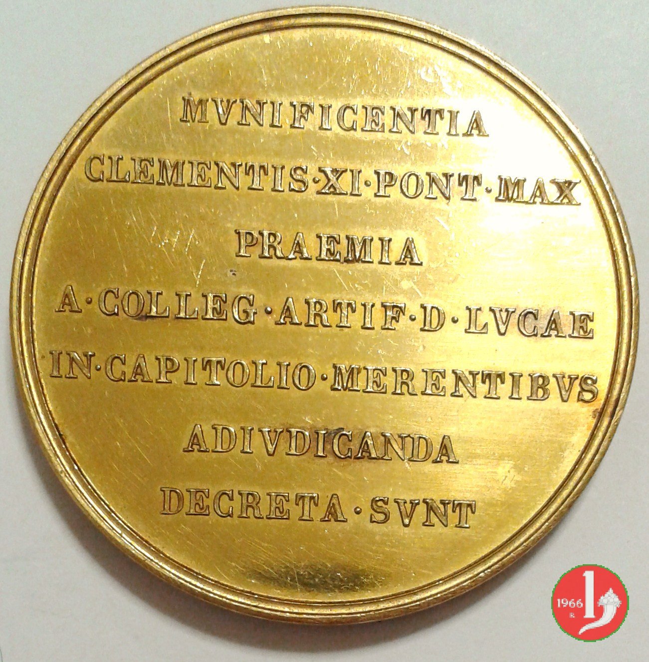 Verso: MVNIFICENTIA = CLEMENS • XI • PONT • MAX = PRAEMIA = A • COLLEG • ARTIF • D • LVCAE = IN • CAPITOLO • MERENTIBVS = ADIVDICADA = DECRETA • SVNT