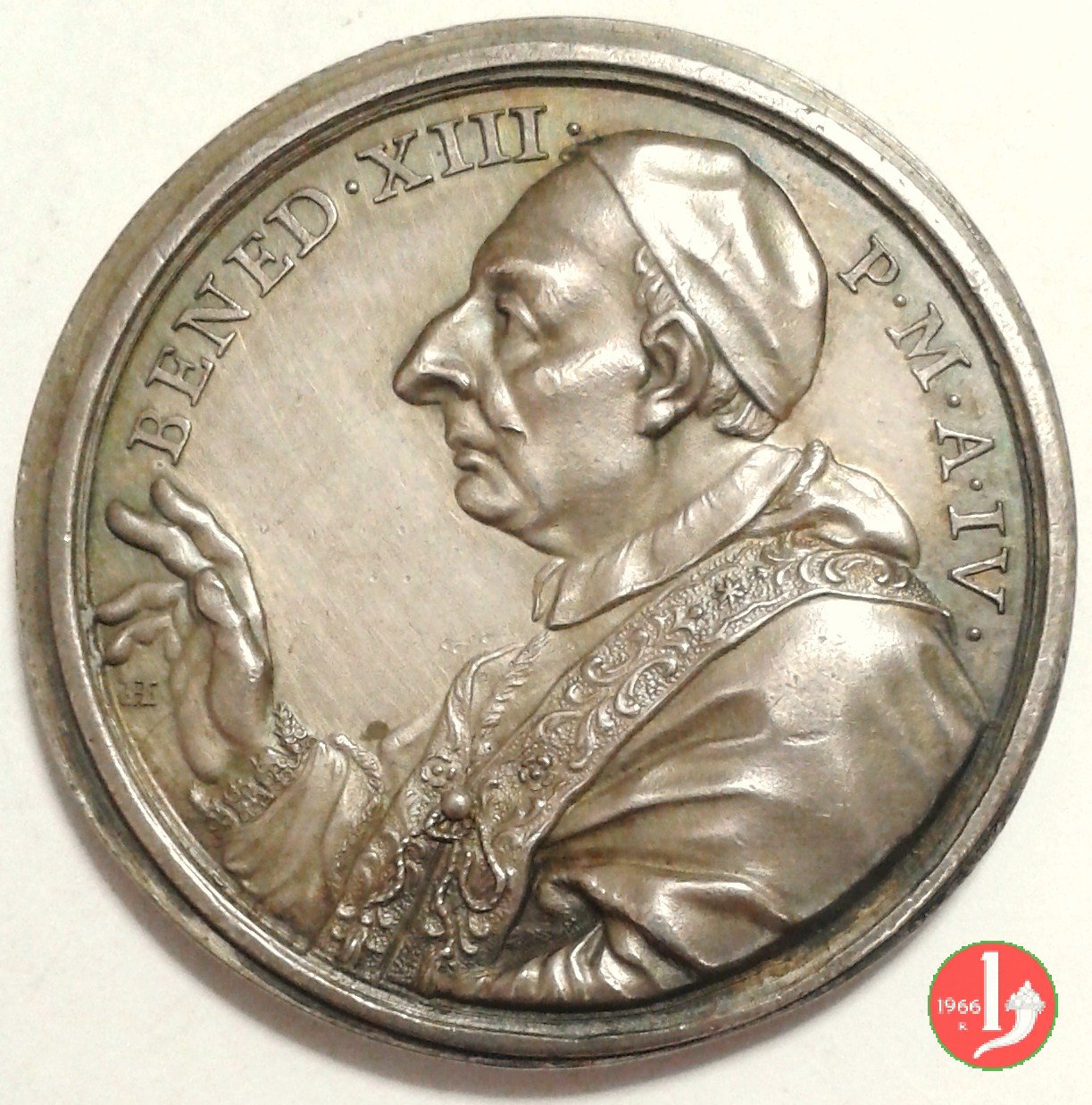Lavanda dei piedi A. IV -M220 Dritto: BENEDICTVS • _ • XIII • P • M • A • IV • busto con camauro, mozzetta es tola a dx sul taglio spalla: HAMERANI Gesú a dx raggiante genuflesso verso sx lava i piedi a S. Pietro in esergo: EXEMPL • DEDI = • VOBIS • |
